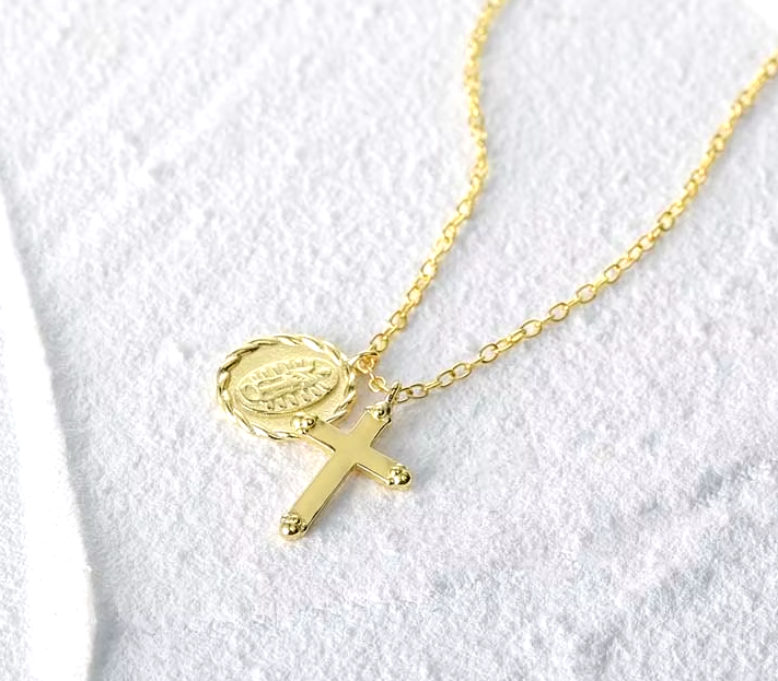 COLLAR DE PLATA BAÑADO EN ORO CRUZ Y VIRGEN